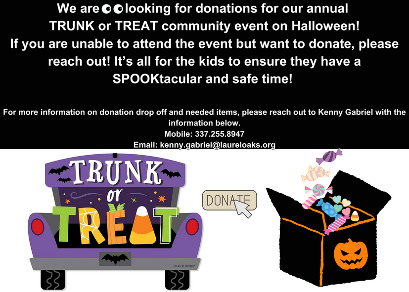 You can also drop off your Halloween candy for the annual Trunk or Treat at the next HOA Meeting which will be held on Tuesday, October 21 between 7 p.m. and 8 p.m. We look forward to seeing you and hope you can donate or volunteer for this kid focused event!