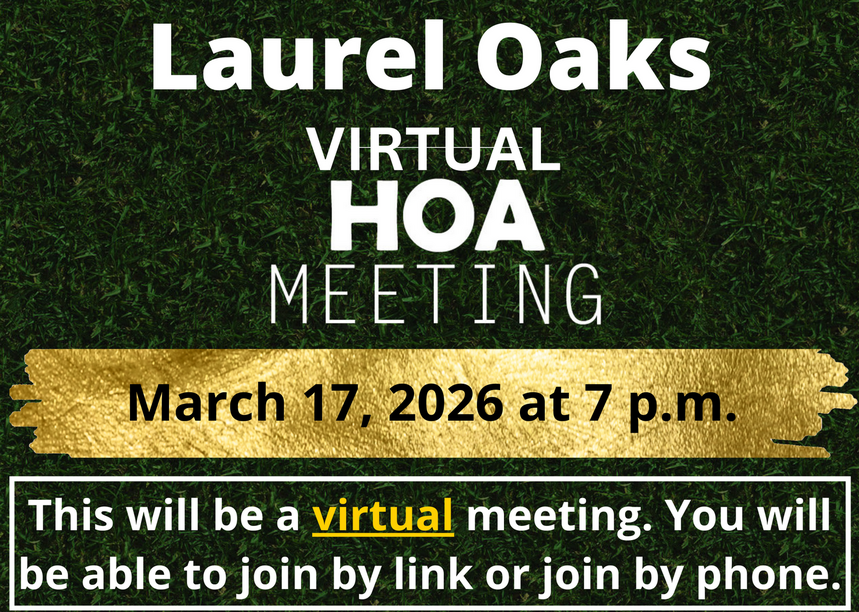 Hey Laurel Oaks Nation! The next HOA meeting will be in a virtual format and will take place on Tuesday, February 17, 2026, at 7 p.m. You have the option to join the call by clicking on a link or joining by phone. The information is highlighted below for your reference.