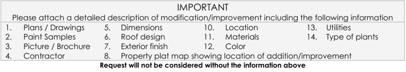 You must have submit the completed Architectural Request Form below with supplemental documents to prevent delays of a decision.